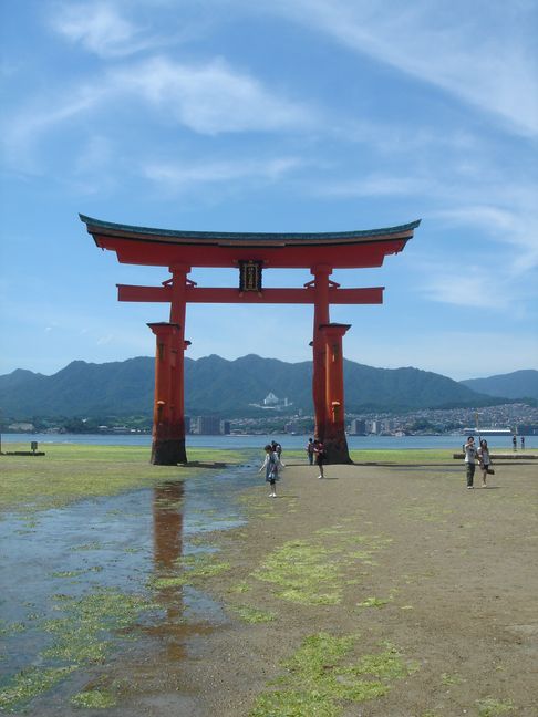 En raison de sa position en bord de mer, le sanctuaire semble flotter à marée haute. Le torii, quant à lui, n’est accessible depuis le rivage qu’à marée basse.