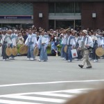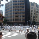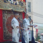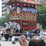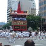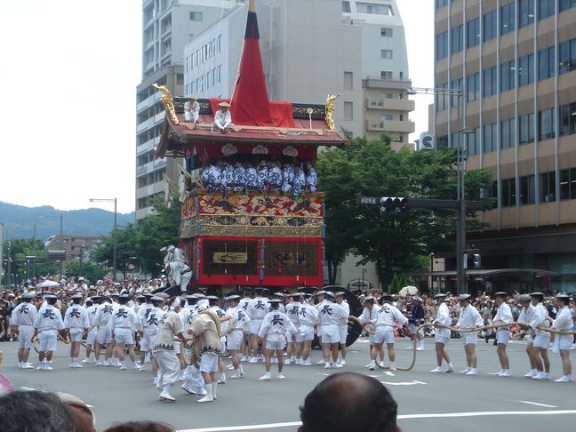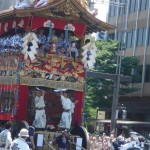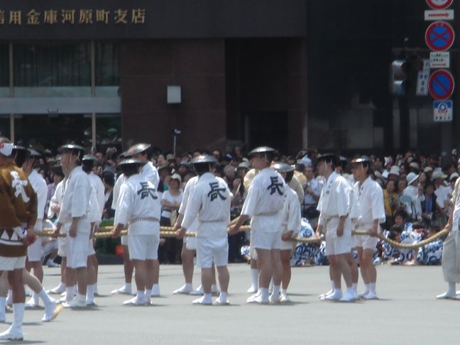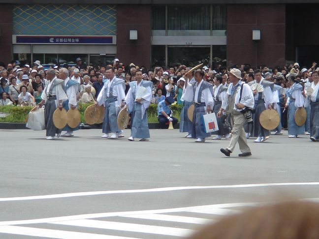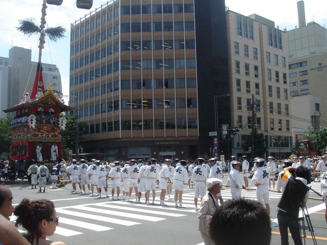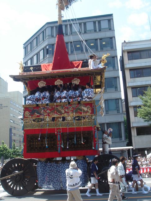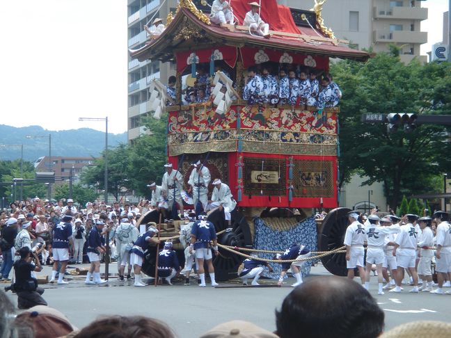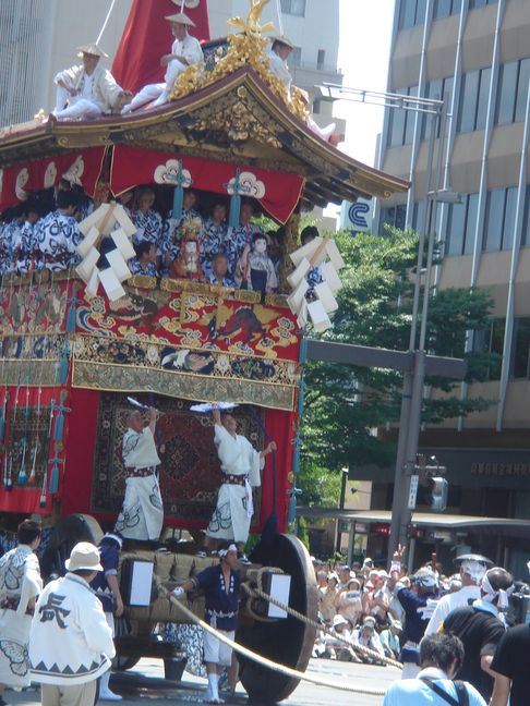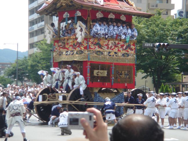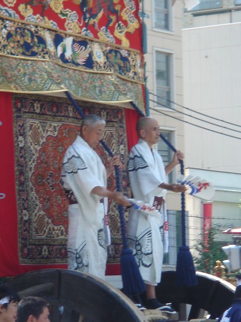 A lieu alors un véritable défilés d’une trentaine de chars accompagnés de flûtes, de tambours et de gongs. Ces chars représentent les différents quartiers ou corporations de la ville. On peut apercevoir des geiko et des maiko sur le seuil de leur maison lors de ce festival.